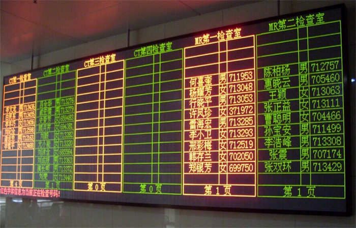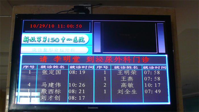 分診區(qū)綜合顯示屏,顯示等候患者與正在呼叫的患者信息, 綜合顯示屏可用液晶電視加機(jī)頂盒方式,也可用LED顯示屏顯示