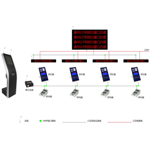 1.連接方式:排隊機部分通過無線收發(fā)器,分別與呼叫器與顯示屏連接、窗口屏及呼叫器通過超5類網線進行串聯,在末端連接無線收發(fā)器,進行信息的接收及發(fā)送.