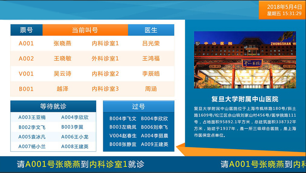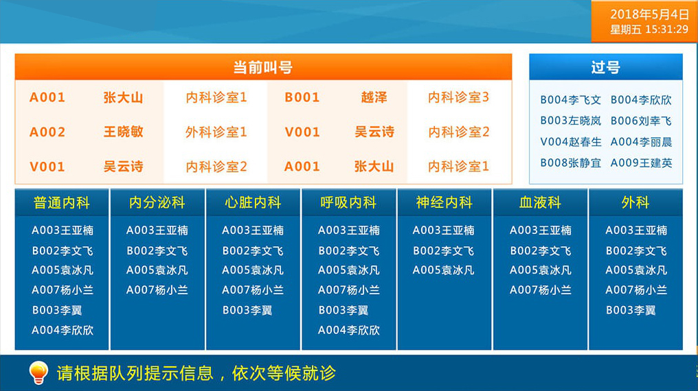 6、支持顯示等候人員的排隊(duì)號碼、姓名和科室信息。
