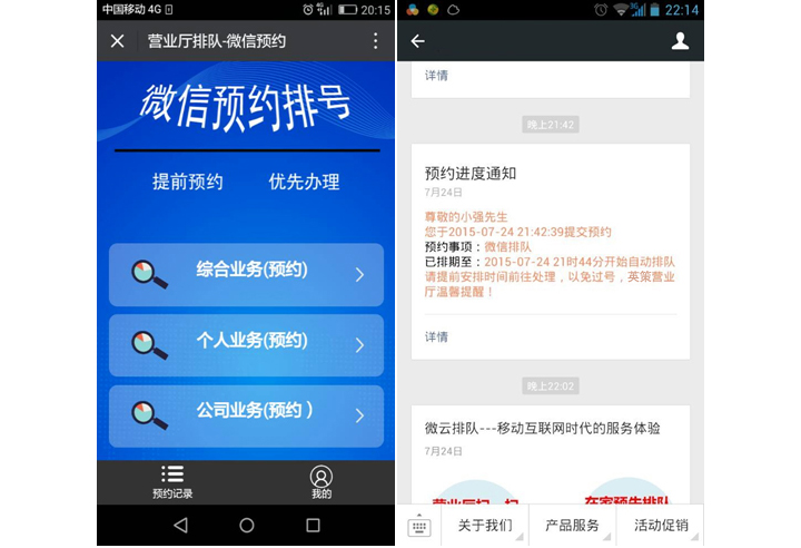 系統(tǒng)支持預(yù)約排隊(duì)。如想在明天10點(diǎn)到營(yíng)業(yè)廳辦理業(yè)務(wù),可以提前預(yù)約,系統(tǒng)也會(huì)提前微信通知用戶以免遺忘,預(yù)約有多種模式。