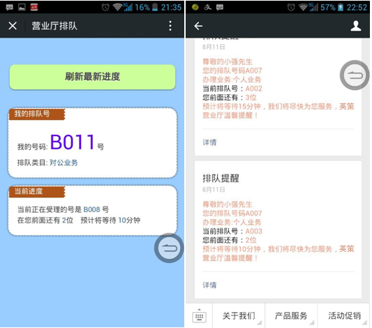 1、取號(hào)方式突破傳統(tǒng)取號(hào)機(jī)模式。英策微信排隊(duì)則讓用戶掃一掃二維碼即可進(jìn)入排隊(duì),在微信上可實(shí)時(shí)觀察自己面前還有多少人在排隊(duì),做到精準(zhǔn)排隊(duì),微信會(huì)自動(dòng)發(fā)送實(shí)時(shí)消息到粉絲手機(jī)提醒用戶以免錯(cuò)過(guò)。